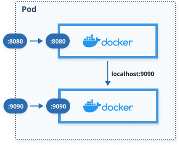 localhost. For example, the container in the figure below could use localhost:9090 to talk to the second container. Anything outside of the pod would still use the unique pod IP and the port number.