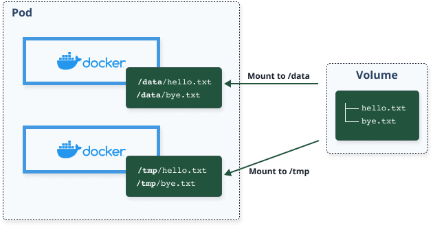 hello.txt and bye.txt. Within your pod specification, you can create a volume mount and mount the volume to a specific path within your container. The figure below shows the two files mounted to the /data folder on the top container and /tmp folder on the second container.