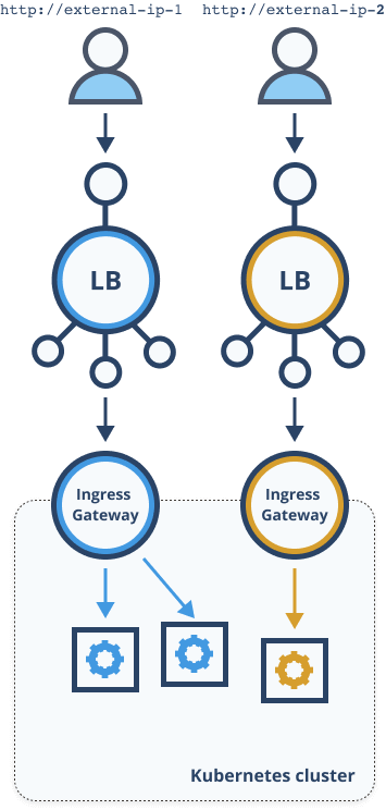 In this scenario, you have two different external IPs that point to two different ingress gateways that run inside the same Kubernetes cluster. Let's look at how to achieve this.