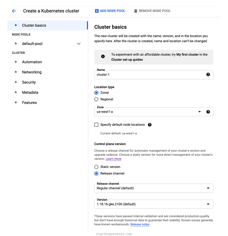 - For the Release channel, we will leave the defaults - Regular channel and 1.18.16-gke.2100
