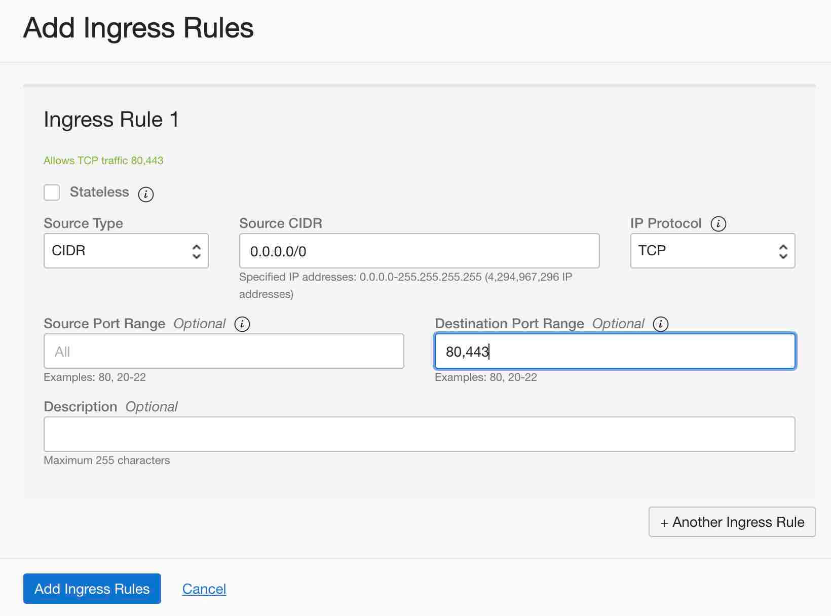 Click the Add ingress rule button to add the ingress rule to the default security list. By doing this, we're allowing ingress (incoming) traffic from any IP address to ports 80 and 443.