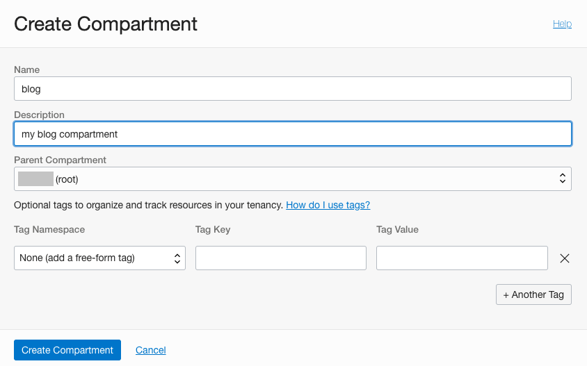 To create a compartment, click the Create compartment button. You can pick a name/description and the parent compartment name. In my case, I named my compartment blog and chose the root compartment as its parent.