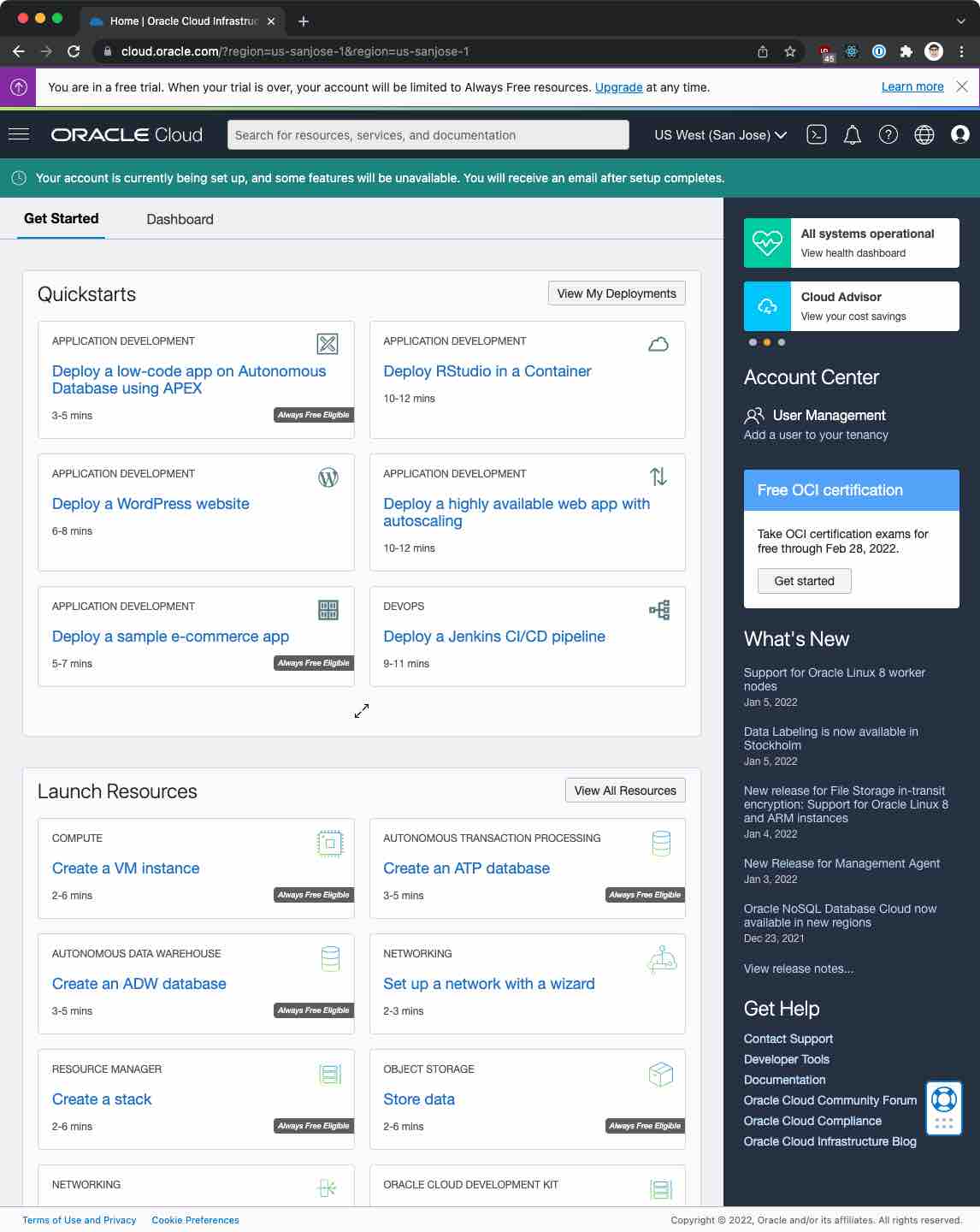 After you've logged in, you'll end up on the OCI dashboard screen, as shown below.