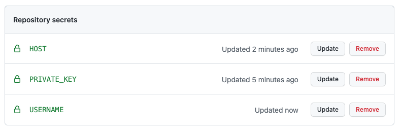 To get this action to work, we'll need to give it the IP address of the VM and the private SSH key required to log in to the machine. The action will read the private key from a Github secret we'll set up later.