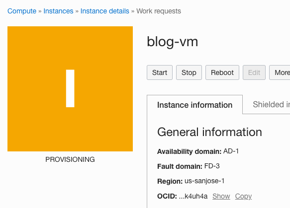 After a couple of minutes, OCI creates the instance - the status of the instance changes from provisioning to running.